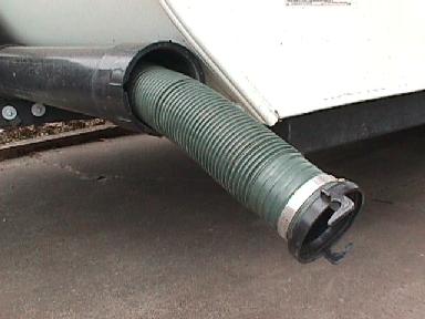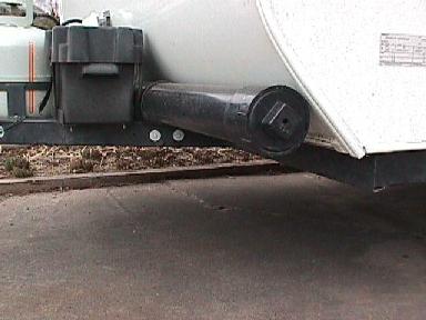 This picture Shows the 6" black foam walled black ABS pipe mounted on the tongue.  Straps are made from a wide serpentine fan belt fastened with fender washers and bolts.  I also glued on pieces of ABS pipe on the bottom of the pipe to keep it from sliding from one end to the other when pushing the hose into it.