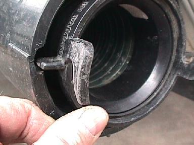 To enable the coupling that is attached to the hose to fit inside the 6" threaded cap fitting, I had to put two notches in it to match the thumb flanges.  I used a drill bit in a router to do this since that drill bit enabled me to make a deep enough notch that is deeper than the threaded part of the end fitting.